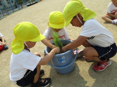 今日は“田植え”をしました。ぞう・らいおん組さんは田んぼに行って田植えをしました。泥の中に入ると「なんかあったかいな~」「足が抜けない( ノД`)シクシク…」等と言っていました。らいおん組さんは去年も経験しているので「出来た~!次ください!」と慣れた手つきでやってくれました。ぞう組さんは初めて入る田んぼで最初は戸惑っていましたが徐々に慣れて頑張って植えてくれました。秋にはお家の人と一緒に稲刈りしようね♬