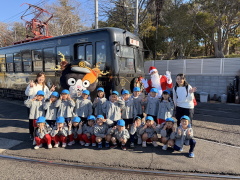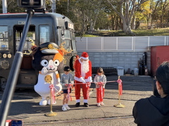 東山まで大型バスに乗り、クリスマス電車のテープカット!クリスマス電車に乗って東山~岡山間をサンタクロースと一緒に車内を過ごしました。