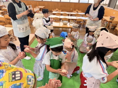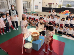 子どもたちは力いっぱい「ぺったんぺったん」の掛け声に合わせてお餅をつきました。出来上がったお餅を綺麗に丸めてお正月用のお飾りが出来ました♬